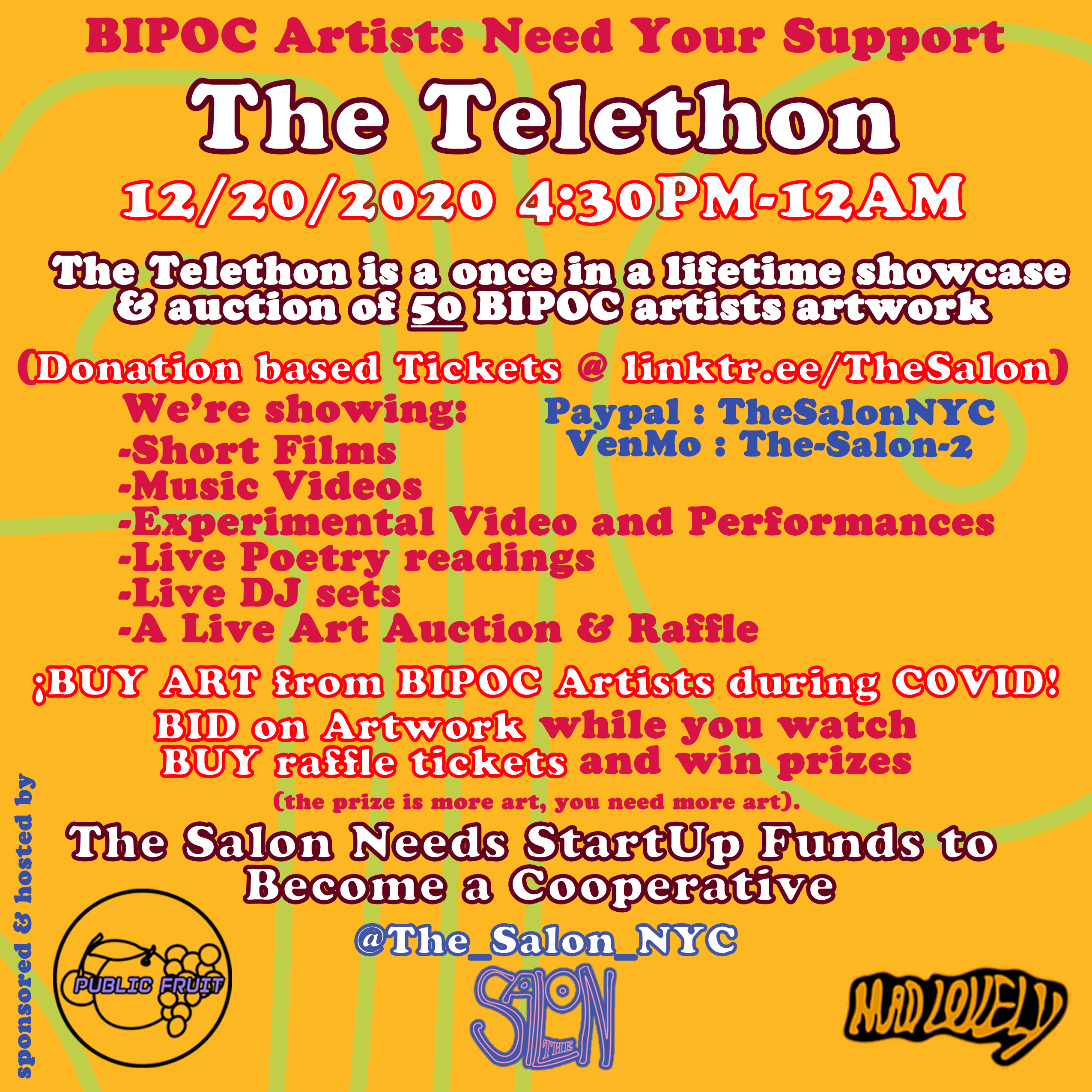The Salon is an artist support group that is fundraising for start up costs to become a cooperative. By attending The Telethon you will help us provide artist support that looks like: